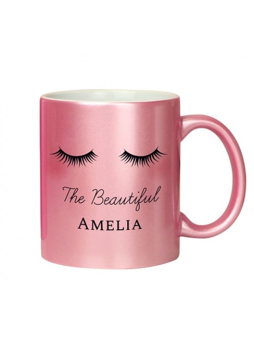 It has a quirky eyelash design on a pink glitter background